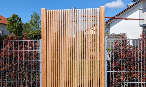 Hier durften wir ein speziell angefertigtes, 180cm hohes Holzsichtschutzelement (Sonderanfertigung) aus sibirischer Lärche mit passenden Pyramidenpfosten verbauen, die das Element optimal einrahmen. Eine schöne Abwechslung im Doppelstabmattenzaun.