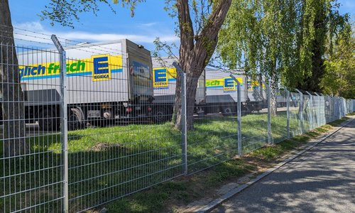 Zur Sicherheit und Abgrenzung des Firmengeländes wurde hier ein zwei Meter hoher, feuerverzinkter Doppelstabmattenzaun mit zusätzlichem, dreireihigem Stacheldrahtaufsatz errichtet.