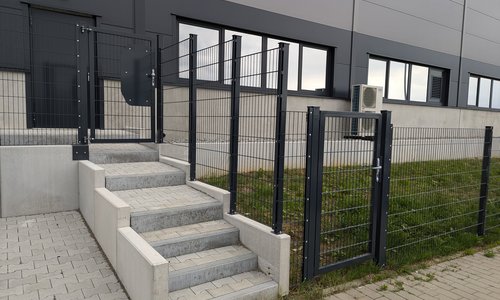 Auf der Treppe des Firmengeländes wurde hier, passend zum Zaun, feuerverzinkt und in RAL7016 pulverbeschichtet, ein einflügeliges Personentor mit Doppelstabmattenfüllung montiert. Zur Sicherheit wurde, passend zum Tor, ein Durchgreifschutz sowie ein fester Knauf auf der Außenseite am Tor angebracht.