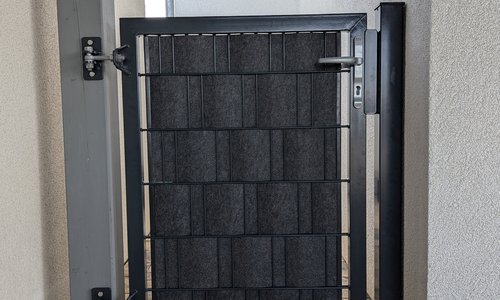 Passend zwischen Hauswand und Holzbalken wurde hier ein 120cm hohes, einflügeliges Tor mit Doppelstabmattenfüllung, feuerverzinkt und pulverbeschichtet in RAL7016, angebracht. Um ausreichend Privatsphäre zu wahren, wurde ein graues Designvlies als Sichtschutz eingewoben.