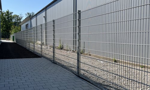 Doppelstabmatten schwer verzinkt mit Pfosten 40x60 verzinkt mit Abdeckleisten einbetoniert |