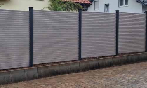 Aluminium-Sichtschutz in graubraun an anthrazitfarbenen Alupfosten