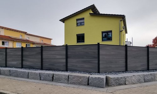 BPC Sichtschutzelemente an anthrazitfarbenen Alupfosten