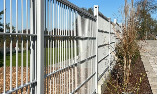 Das Bild zeigt einen hochwertigen Doppelstabmattenzaun mit stabilen Aluminium-Pfosten, der auf Mauerscheiben aufgedübelt ist. Die Doppelstabmatte dient als Füllung und ist in der Sonderfarbe RAL 9006 Weißaluminium gestaltet, wodurch der Zaun eine moderne, edle Ausstrahlung erhält. Oben und unten sind Abschlussprofile angebracht, die die Doppelstabmatte optisch einrahmen und dem Zaun eine klare, saubere Linienführung verleihen. Die Kombination aus robusten Aluminium-Pfosten und der sorgfältig eingefassten Doppelstabmatte ergibt eine langlebige und zugleich elegante Lösung für eine zeitgemäße Grundstücksabgrenzung.