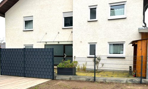 Doppelstabmatten schwer vorverzinkt und anthrazit beschichtet mit Pfosten 60 x 40 mit Abdeckleisten einbetoniert |