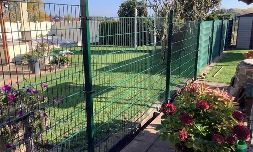 Doppelstabmatten leicht feuerverzinkt und grün beschichtet mit Pfosten 60 x 40 mit Bügel einbetoniert |