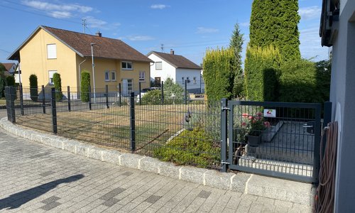 Doppelstabmatten schwer feuerverzinkt und anthrazit beschichtet mit Pfosten 60 x 40 mit Abdeckleisten einbetoniert |