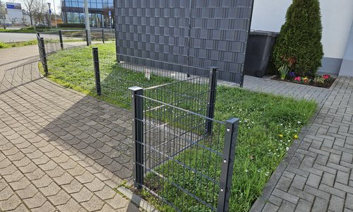 Doppelstabmatten leicht feuerverzinkt und anthrazit beschichtet mit Pfosten 60 x 40 mit Abdeckleisten einbetoniert |