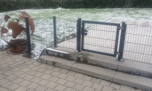Doppelstabmatten leicht feuerverzinkt und anthrazit beschichtet mit Pfosten 60 x 40 mit Abdeckleisten einbetoniert |