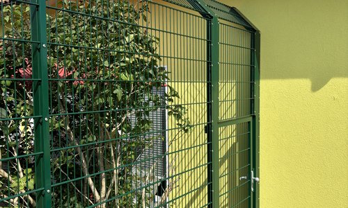 Fence type: Doppelstabmatten schwer feuerverzinkt und grün beschichtet mit Pfosten 60 x 40 mit Abdeckleisten einbetoniert