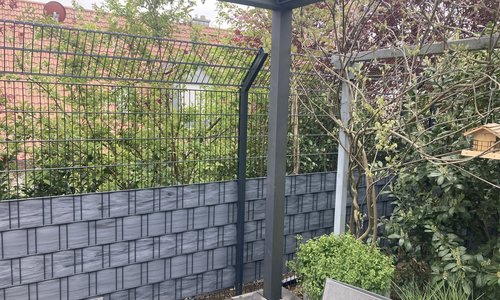 Doppelstabmatten schwer feuerverzinkt und anthrazit beschichtet mit Pfosten 60 x 40 mit Abdeckleisten einbetoniert |