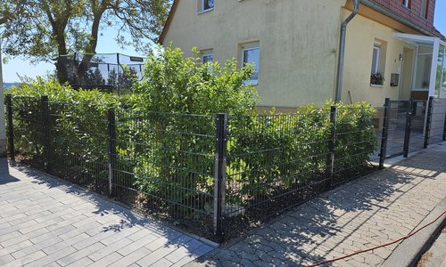 Doppelstabmatten schwer feuerverzinkt und anthrazit beschichtet mit Pfosten 60 x 40 mit Abdeckleisten einbetoniert |