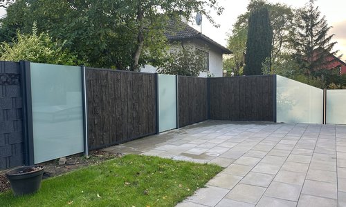 Glas Sichtschutz mit vierkant Aluminium-Nutpfosten einbetoniert |