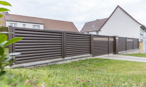 Projekt: | Aluminium Flügeltor, Pforte, Zaunfeld in Holzoptik |
