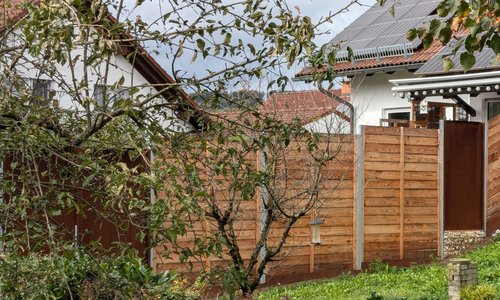 Sichtschutzzaun aus Lärchen Brettern, kombiniert mit Design-Cortenstahl auf Steinkörben