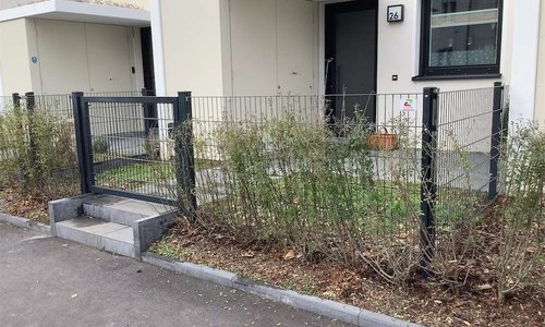 Doppelstabmatten schwer vorverzinkt und anthrazit beschichtet mit Pfosten 60 x 40 mit Abdeckleisten einbetoniert |