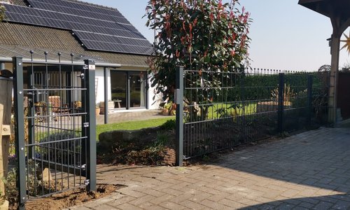 Der Kunde brauchte eine Lösung seinen Parkplatz von seinen Garten zu trennen und hat sich für die Decorvariante gerade mit Kugel entschieden. Die Tür sollte allerdings die normale Systemtür werden. Wir konnten mit 2 Decormatten den ganzen Zaun herstellen, indem die 2. Matte 2 mal zugeschnitten wurde.