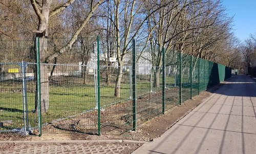 Doppelstabmatten leicht feuerverzinkt und grün beschichtet mit Pfosten 60 x 40 mit Abdeckleisten einbetoniert |