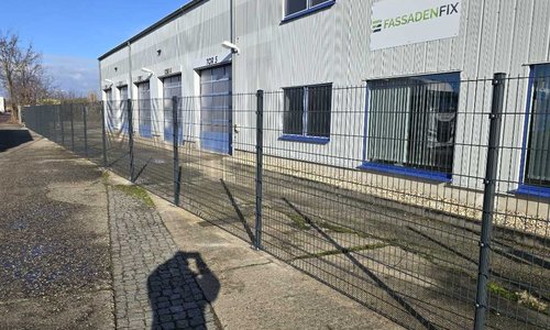 Doppelstabmatten leicht vorverzinkt und anthrazit beschichtet mit Pfosten Vario mit Fussplatte |