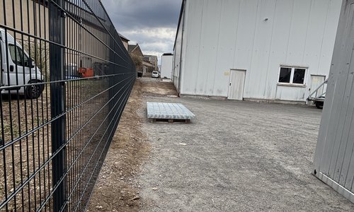 Doppelstabmatten schwer vorverzinkt und anthrazit beschichtet mit Pfosten 60 x 40 mit Abdeckleisten einbetoniert |