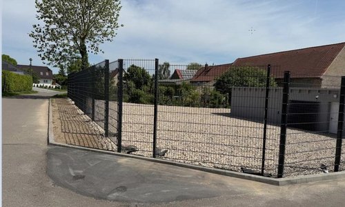 Doppelstabmatten schwer verzinkt mit Pfosten 40x60 verzinkt mit Abdeckleisten einbetoniert |
