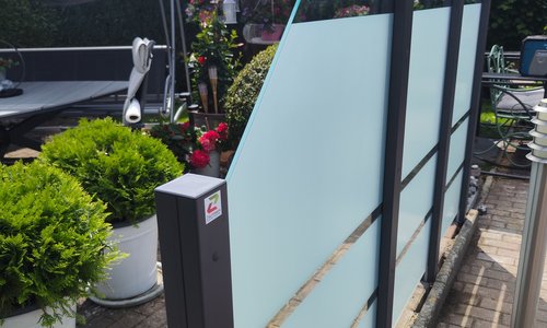 Glas Sichtschutz mit vierkant Aluminium-Nutpfosten einbetoniert |