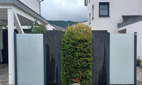 Glas Sichtschutz mit vierkant Aluminium-Nutpfosten einbetoniert |