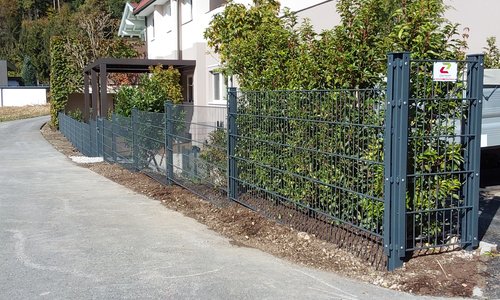 Doppelstabmatten leicht feuerverzinkt und anthrazit beschichtet mit Pfosten 60 x 40 mit Abdeckleisten einbetoniert |