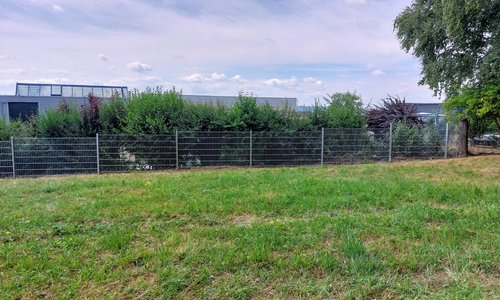 Fence type: | Doppelstabmatten schwer verzinkt mit Pfosten 40x60 verzinkt mit Abdeckleisten einbetoniert |