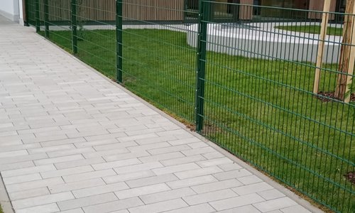 Doppelstabmatten schwer vorverzinkt und grün beschichtet mit Pfosten 60 x 40 mit Abdeckleisten einbetoniert |