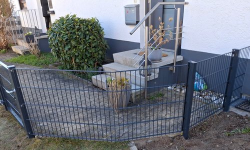 Doppelstabmatten leicht feuerverzinkt und anthrazit beschichtet mit Pfosten 60 x 40 mit Abdeckleisten einbetoniert |
