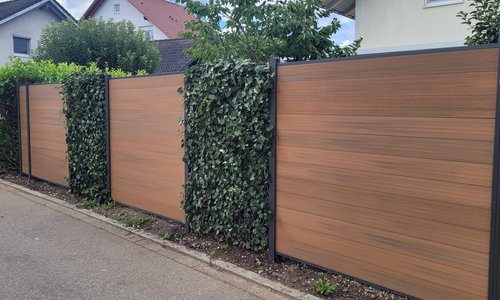 WPC-Sichtschutzzaun an Aluminium-Pfosten kombiniert mit Efeu Hecke