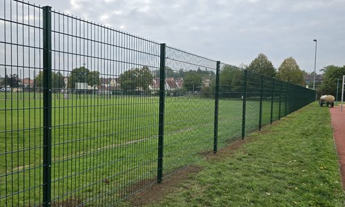 Doppelstabmatten schwer feuerverzinkt und grün beschichtet mit Pfosten 60 x 40 mit Abdeckleisten einbetoniert |