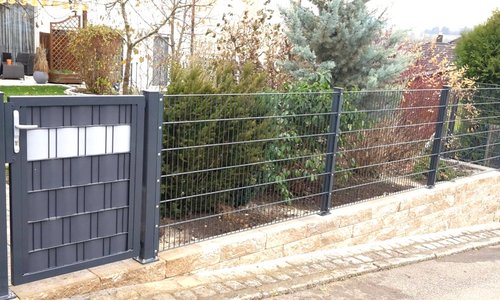Doppelstabmatten schwer feuerverzinkt und anthrazit beschichtet mit Pfosten 60 x 40 mit Abdeckleisten mit Fussplatte |