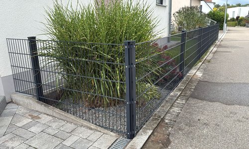 Doppelstabmatten schwer feuerverzinkt und anthrazit beschichtet mit Pfosten 60 x 40 mit Abdeckleisten einbetoniert |