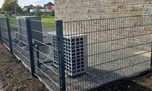 Doppelstabmatten schwer feuerverzinkt und anthrazit beschichtet mit Pfosten 60 x 40 mit Abdeckleisten einbetoniert |