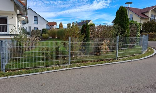 Doppelstabmatten schwer verzinkt mit Pfosten 40x60 verzinkt mit Abdeckleisten einbetoniert |