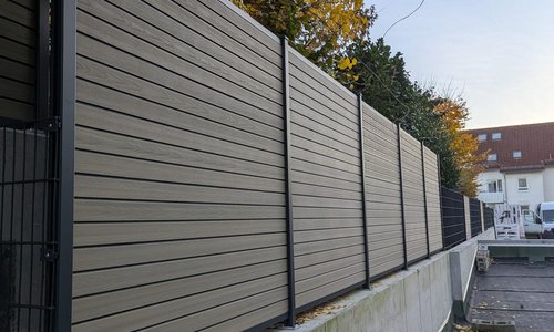 Der 180 cm hohe BPC-Sichtschutzzaun mit moderner Rhombusfüllung in der Farbe Ginger kombiniert natürliche Optik mit hoher Widerstandsfähigkeit. Die anthrazitfarbenen Pfosten setzen dabei einen stilvollen Kontrast zur warmen Ginger-Tonung der Elemente und verleihen dem Zaun eine elegante, zeitgemäße Wirkung. Auf einer Betonmauer sicher aufgeschraubt, bietet die Konstruktion maximale Stabilität und Windfestigkeit. Dank der geschlossenen Rhombusstruktur schützt der Zaun zuverlässig vor unerwünschten Blicken und sorgt so für perfekte Privatsphäre im Garten.