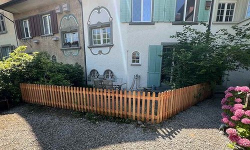Staketen Holz vor die Pfosten / T-Stahl Pfosten feuerverzinkt einbetoniert |