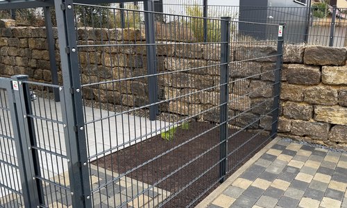 Doppelstabmatten schwer feuerverzinkt und anthrazit beschichtet mit Pfosten 60 x 40 mit Abdeckleisten einbetoniert |