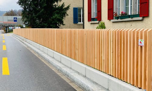 Lärchenzaun Holz vor die Pfosten mit T-Stahlpfosten verzinkt einbetoniert |