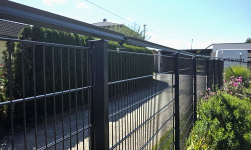 Doppelstabmatten schwer feuerverzinkt und anthrazit beschichtet mit Pfosten 60 x 40 mit Abdeckleisten einbetoniert |