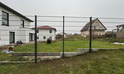 Doppelstabmatten schwer vorverzinkt und anthrazit beschichtet mit Pfosten 60 x 40 mit Abdeckleisten einbetoniert |