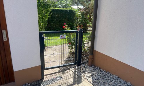 Doppelstabmattentüre mit angepasstem Zaunelement zwischen zwei Wänden