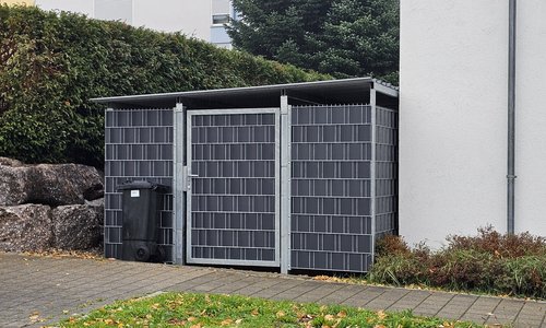 Mülleimer-Einfassung inkl. Türe mit Sichtschutzstreifen verkleidet sowie einer Dachkonstruktion