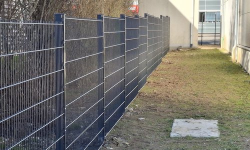 Doppelstabmatten schwer feuerverzinkt und anthrazit beschichtet mit Pfosten 60 x 40 mit Abdeckleisten einbetoniert |