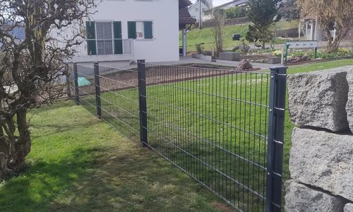 Doppelstabmatten leicht vorverzinkt und anthrazit beschichtet mit Pfosten 60 x 40 mit Abdeckleisten einbetoniert |