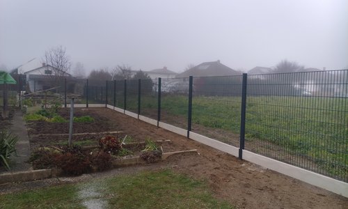 Doppelstabmatten schwer vorverzinkt und anthrazit beschichtet mit Pfosten 60 x 40 mit Abdeckleisten einbetoniert |