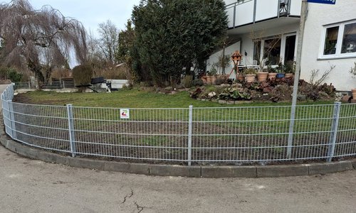 Doppelstabmatten schwer verzinkt mit Pfosten 40x60 verzinkt mit Abdeckleisten einbetoniert |