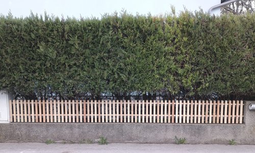 Lärchenzaun Holz vor die Pfosten mit T-Stahlpfosten verzinkt einbetoniert |